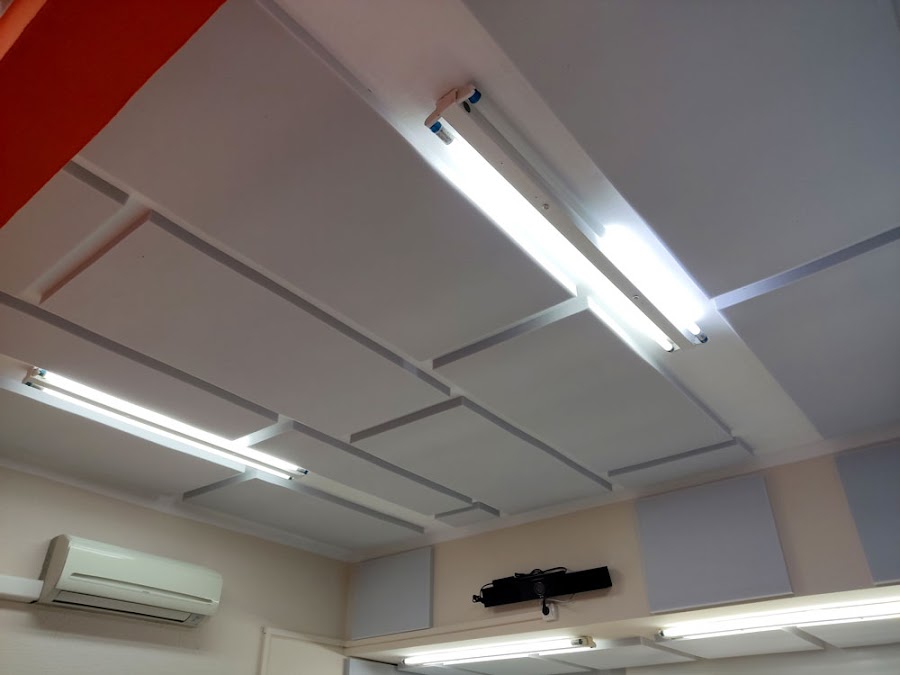 Con las características de estos espacios y con los objetivos marcados, decidimos adherir islas rectangulares en techos y otras islas en zonas altas de los tabiques, aunando eficacia y función estética.