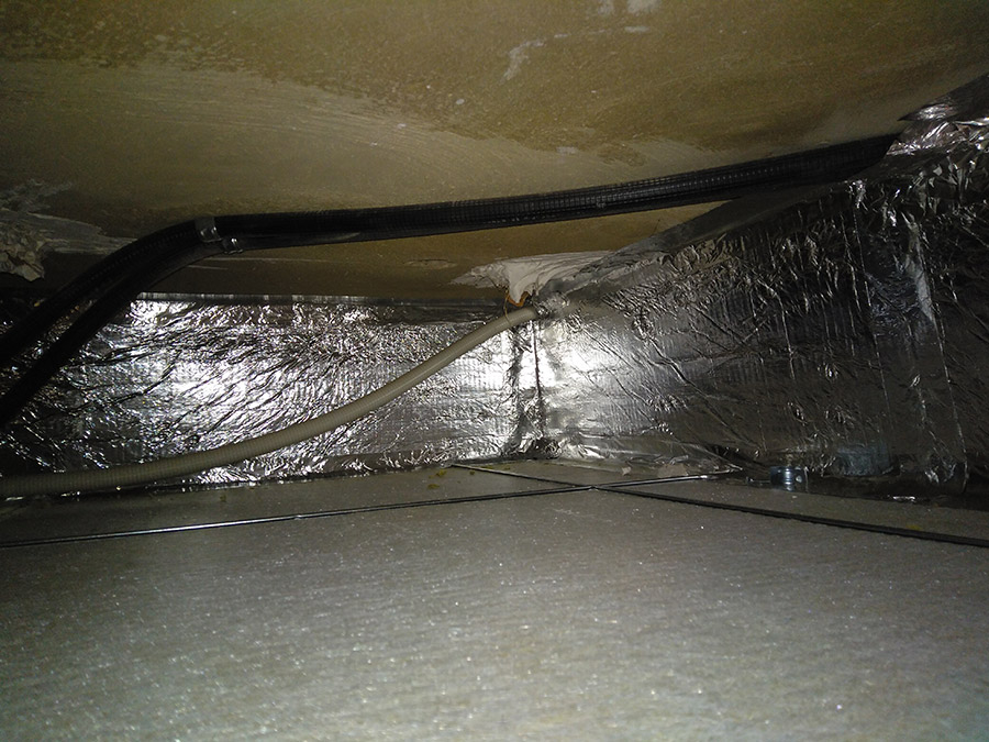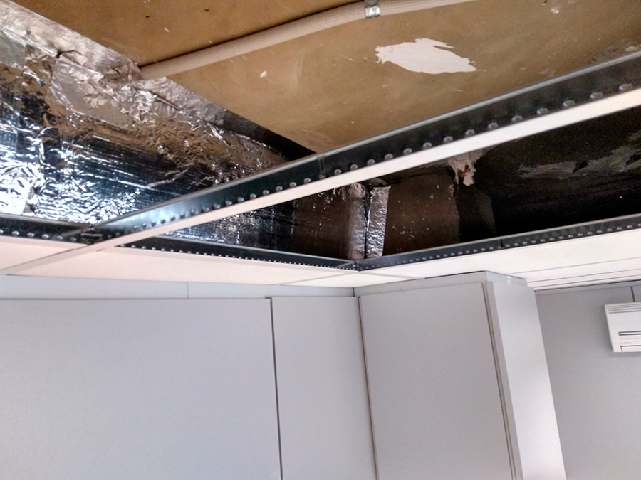 Instalación de barrera fónica sobre mampara de vidrio, entre techo registrable y forjado.